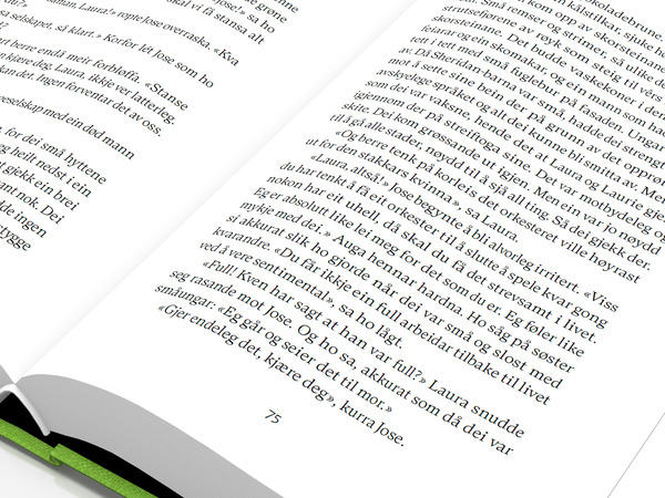 Innbunden med svart tråd, fleksibind med klaffar, heiltrukken i tekstil, kvitt silketrykk.